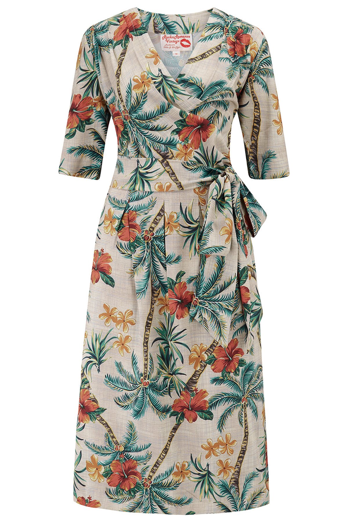 Unleash your inner vintage vixen with the Vivien Full Wrap Dress in Tiki Palm Print—where timeless charm meets a splash of playful paradise. Draped in lush greens and sun-kissed beige, this dress dances with tropical whimsy, all wrapped up in a figure-flattering silhouette that’s both chic and comfortingly soft. The full wrap design ensures a purrfect fit every time, giving you effortless elegance with a hint of mischievous flair. From the delicate chest pleats to the flirtatious flare of the skirt, every detail whispers “class with a dash of sass.” Ready to make a statement, this dress is a stylish time capsule that invites you to channel vintage glam with modern ease.