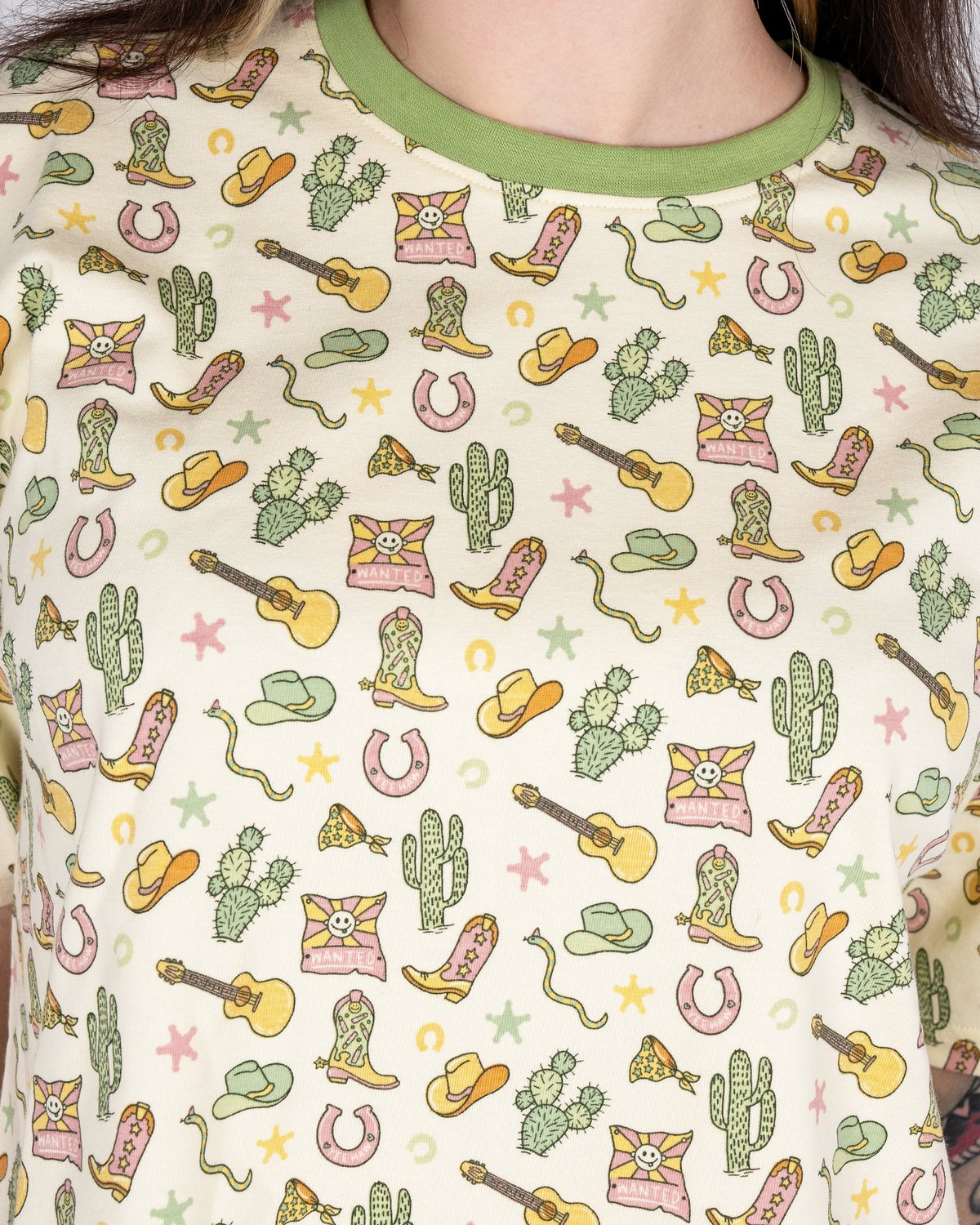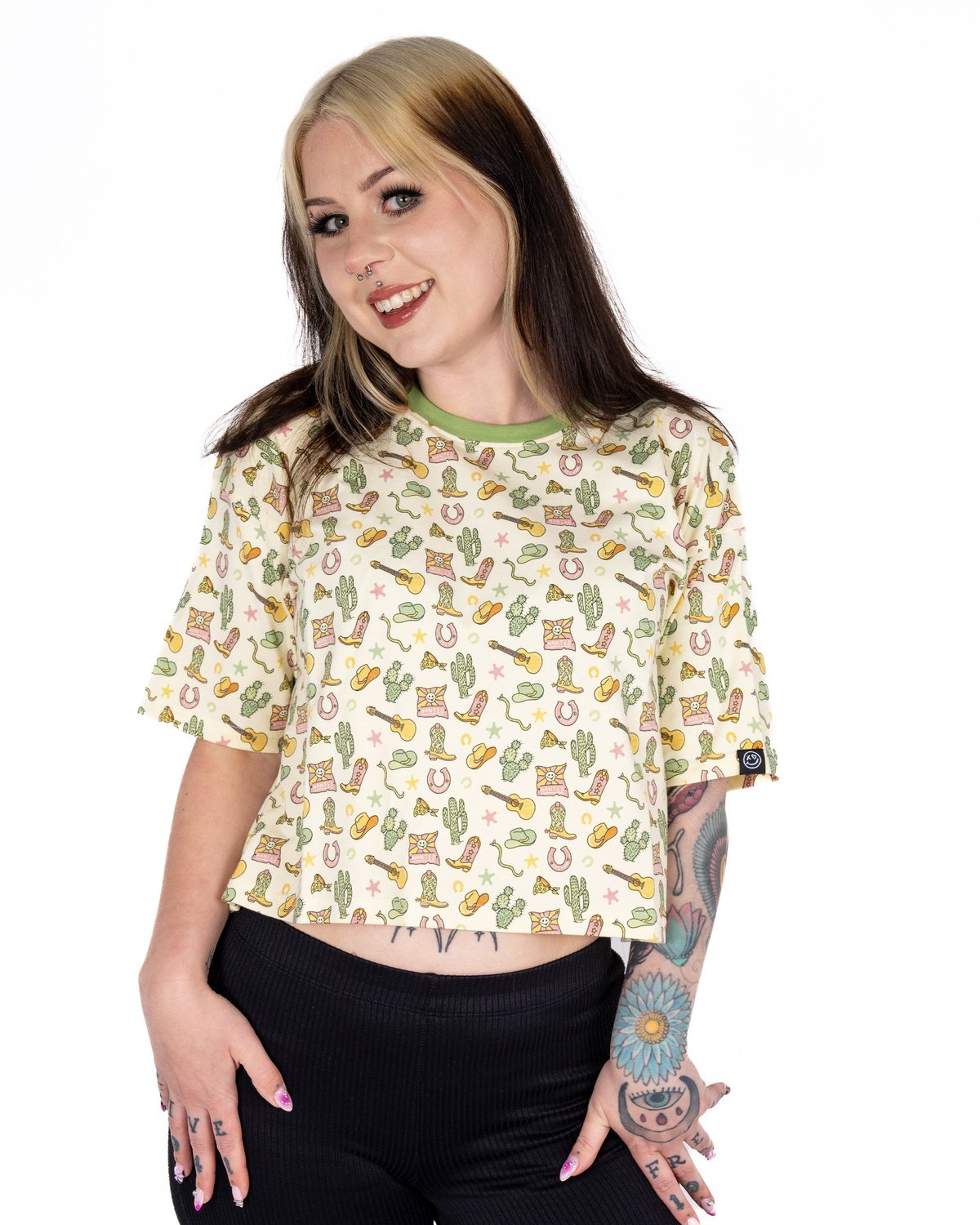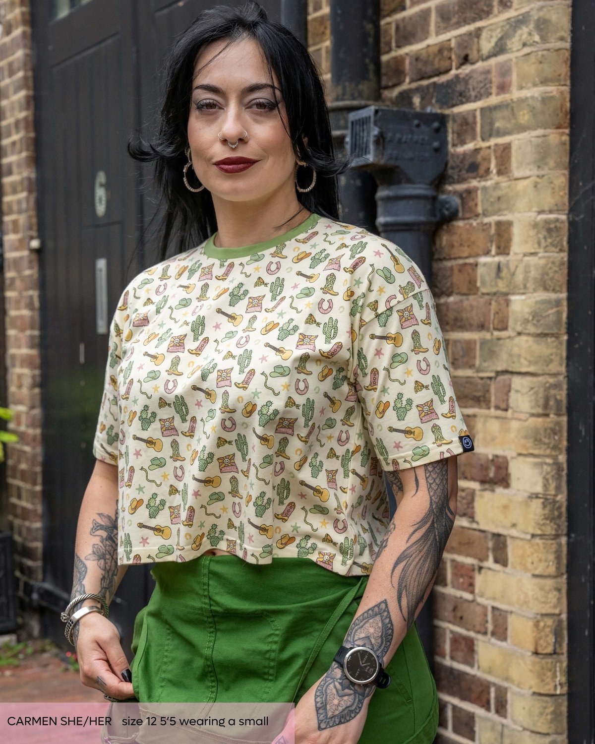 Unleash your inner cowgirl with the Yasmin Cousins Cowboy Cropped Boxy Tee—an ode to playful western charm with a chic twist. The delightful cream canvas features vibrant green accents and whimsical illustrations of stars, snakes, and cacti, all crafted with a fresh, modern vibe. Its cropped, boxy silhouette offers a relaxed yet stylish fit, perfect for mixing and matching with your favorite vintage pieces or layering over a sleek outfit. Designed for those who love to stand out with a dash of mischievous flair, this tee manages to be both playful and polished—claws-down gorgeous, if you ask us.