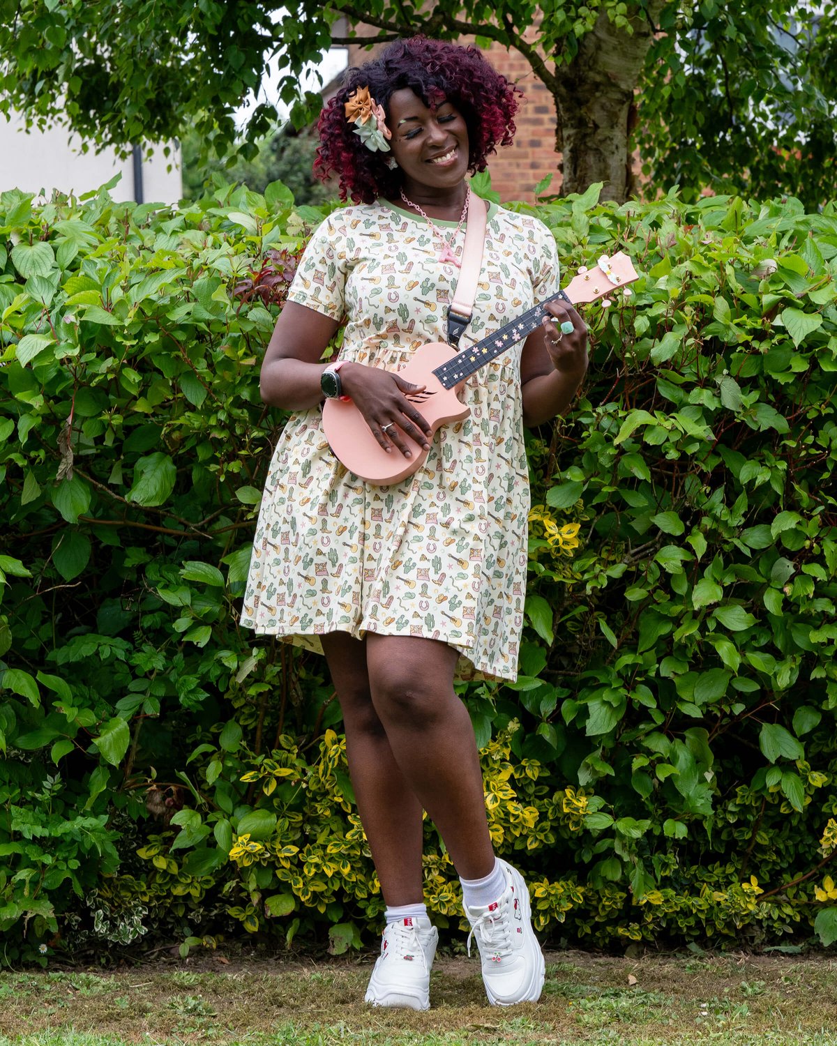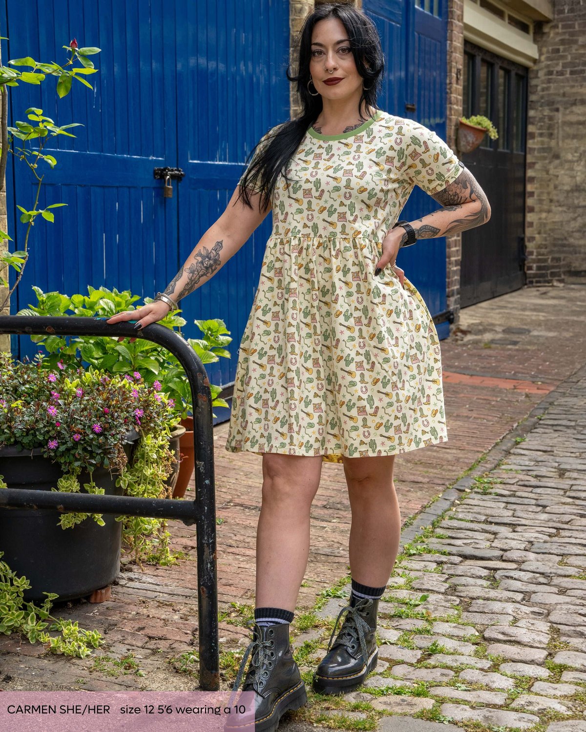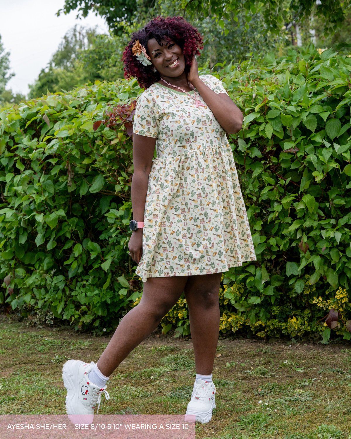🌵Ready to lasso some fun into your style? Kitty Darling’s Cowboy Stretch Smock Dress is just the ticket!🤠 Swirling with cheeky cowboys, cacti, boots, and guitars on a dreamy cream cotton canvas, it’s a dash of rodeo charm in dress form.⭐