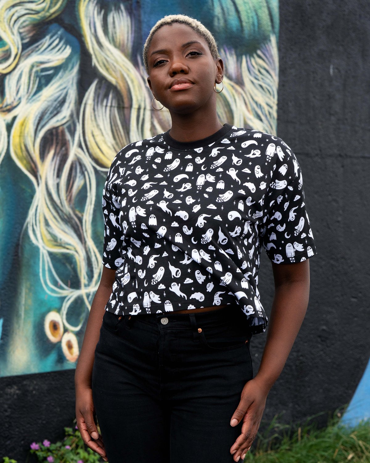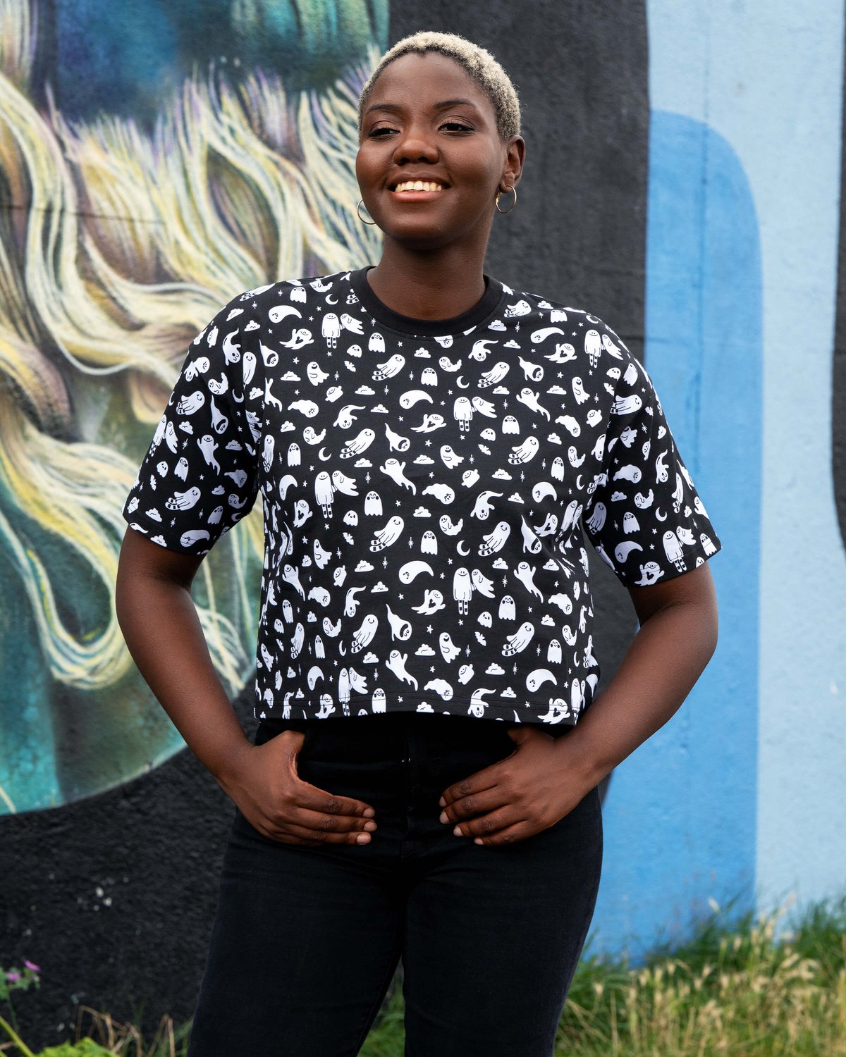 Unleash your playful side with the x Yasmin Cousins Ghosties Cropped Boxy Tee—where spooky charm meets street-smart style. The bold ghost illustrations are a purrfect way to add a mischievous twist to your everyday look, while the relaxed, boxy fit and cropped silhouette keep things effortlessly cool. Crafted from a soft cotton blend, it offers all-day comfort with a hint of stretch, making it ideal for those who like their wardrobe to be as comfy as it is chic. In classic black and white, this tee is a versatile staple that layers beautifully with your favorite jeans, skirts, or dungarees. Ethically made with eco-friendly dyes, it’s a guilt-free style statement that’s as kind to the planet as it is to your wardrobe.