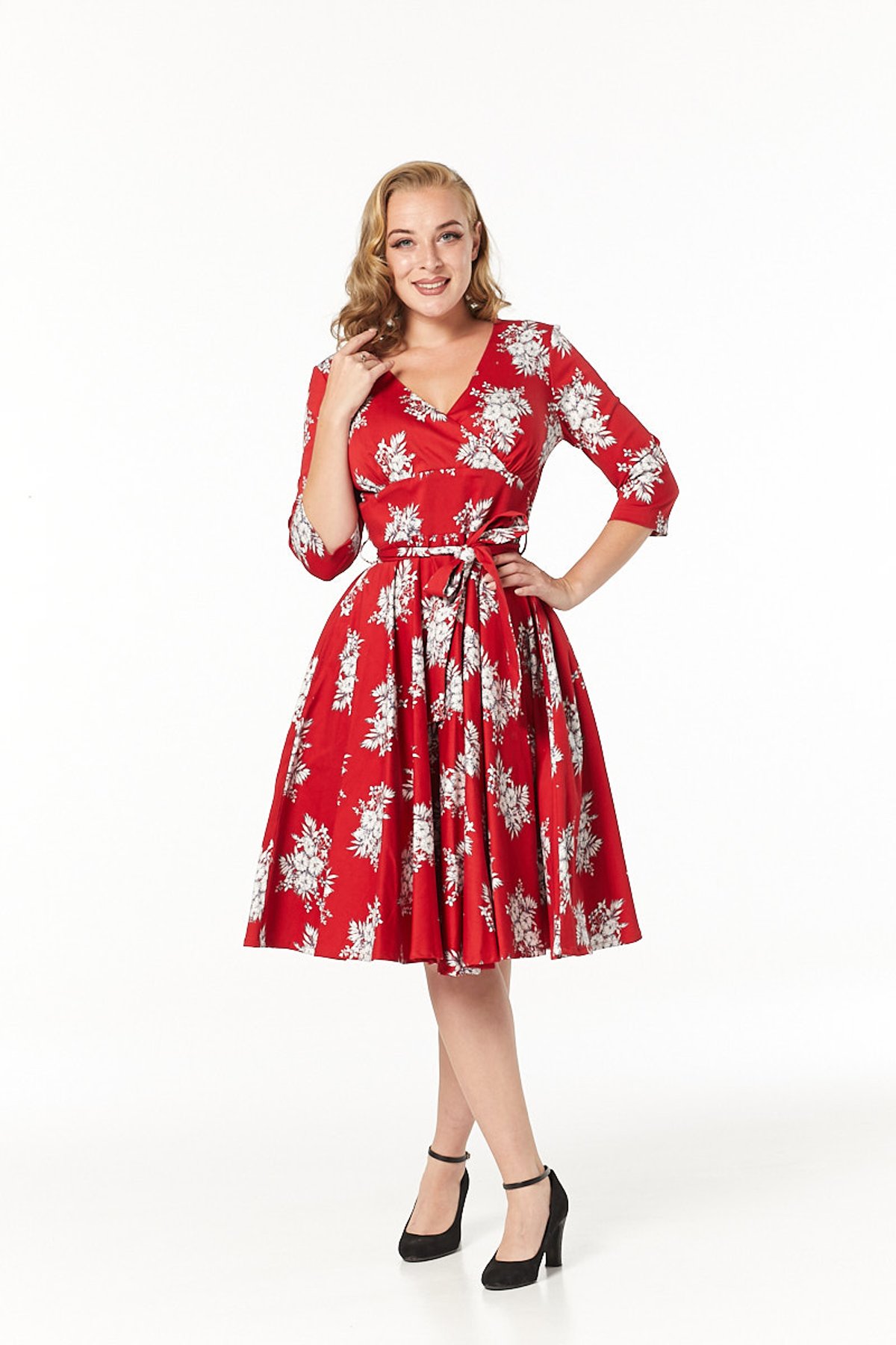 Our Yara Dress is a blooming spectacle of fiery red and pristine white flowers that dance over a classic swing silhouette. 💃👗 Lovingly crafted from a luxurious blend of 97% cotton sateen and 3% elastane, this retro floral tea dress is all about achieving that ‘just right’ fit. It hugs your curves in all the right places, while also allowing for a gentle stretch that flatters any figure.