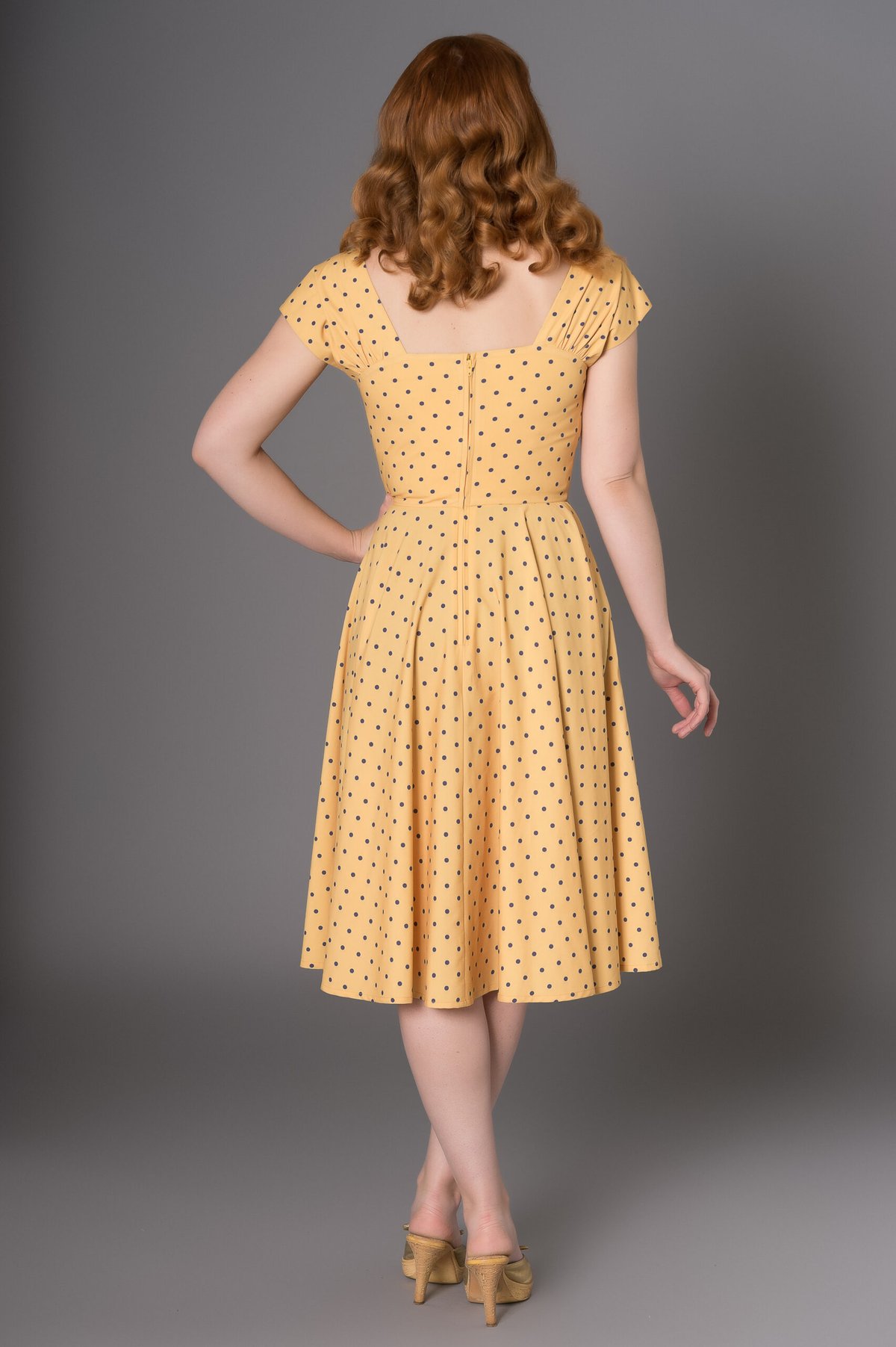 Get ready to pounce on timeless style with the Zafira Dress, where sunny honey yellow meets playful navy polka dots—an irresistible combo that’s all about vintage glamour with a modern wink. The fitted bodice and flared skirt work together to create a silhouette that’s both flattering and fantastically fun to wear. Those faux buttons add just the right dash of retro charm, while the pockets keep it practical enough for your everyday adventures. Whether you’re twirling at a garden party or simply enjoying a sunny day out, this dress is your new go-to for a look that’s oh-so-purrfect.